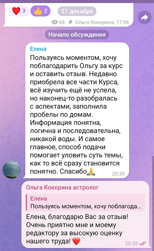 ОТЗЫВЫ О КУРСЕОтзыв из моего Телеграм-канала от 27.12.25 ![]() Мария >> 17.08.2025 Здравствуйте Ольга! Пётр >> 08.04.2025 Ольга, у Вас талант астролога и учителя! Редко встретишь, чтобы человек так любил свой предмет и так хорошо умел его объяснить - просто, понятно и увлечённо. Благодарю за Курс! 🙏🙏🙏 Ольга-администратор >> 08.04.2025 Пётр, большое Вам спасибо за отзыв! 🧡 Отзыв из моего Телеграм-канала от 20.03.25 ![]() Отзыв из моего Телеграм-канала от 15.02.25 ![]() Екатерина >> 27.01.2025 Добрый день! Изучаю ваш курс, уже закрыла для себя очень много спорных и непонятных вопросов в астрологии. Благодарю! Спасибо за ваши знания! Ольга-администратор >> 27.01.2025 Екатерина, спасибо Вам за отзыв! Людмила >> 31.12.2024 Ольга, Здравствуйте!) Ольга-администратор >> 31.12.2024 Людмила, здравствуйте! Наталья >> 17.10.2024 Добрый день! Я не новичок, уже обучалась астрологии. Но благодаря вашему курсу сделала для себя много открытий, прояснила непонятные моменты! 😍 Очень много такой информации, которой нигде нет. СПАСИБО! 🧡🧡🧡 Задала вам вопрос по 4 части курса, жду ответ 🙏 Ольга-администратор >> 17.10.2024 Наталья, большое спасибо за отзыв! В ближайшие дни отвечу на Ваш вопрос, и когда опубликую мой ответ в курсе, оповещу об этом в телеграм. Вероника >> 05.09.2024 Заметила ссылку на отзывы и решила написать. Приобрела 1 часть курса. Прочитала всё за несколько дней. Не могла оторваться! Ваша подача знаний отличается ото всех других астрологов, когда читаешь вас всё сразу становиться понятно, нет никаких недосказанностей или чего-то что приходится додумывать самой. Вопросов у меня пока нет. Информации много и чтобы всё усвоилось буду перечитывать ещё много раз! Спасибо за знания! Ольга-администратор >> 05.09.2024 Вероника, и Вам большое спасибо за отзыв! Ссылку на отзывы перенесла туда, где можно задать мне вопросы по курсу, чтобы те, кто приобрёл курс, сразу могли заметить эту ссылку и написать свой отзыв. Юлия >> 01.09.2024 Ольга и Наталья хочу поблагодарить Вас за курс в доступном формате и по приемлемой цене! Очень удобно, что курс можно покупать частями. И конечно, отдельная и огромная благодарность за все Ваши знания, которыми Вы щедро делитесь! Ольга-администратор >> 01.09.2024 Юлия, спасибо Вам! Татьяна >> 01.09.2024 Я ждала обучения именно от Вас! УРА!!! Очень рада, что Вы запустили курс! Поздравлю Вас и желаю написать Вам и другие курсы по прогнозированию и синастрии! Ольга-администратор >> 01.09.2024 Татьяна, спасибо Вам за поздравления и за хорошие слова! ВОПРОС-ОТВЕТ О КУРСЕТатьяна >> 16.01.2026 Здравствуйте, Ольга, скажите, пожалуйста, если я куплю и изучу курс по астрологии во всех 7 частях, вы дадите документ об образовании, чтобы я могла самостоятельно составлять гороскопы за оплату. Есть ли у вас образовательная лицензия? Ольга-администратор >> 16.01.2026 Татьяна, здравствуйте! Я на этот вопрос уже отвечала. Посмотрите ниже мой ответ Юлии за 03.03.2025 Юлия >> 03.03.2025 Добрый день! Меня очень заинтересовал ваш курс по натальной карте. Планирую его пройти. Подскажите пожалуйста, даётся ли какой нибудь документ( возможно сертификат) о прохождении курса. Беспокоюсь, потому что потонциальные клиенты могут поинтересоваться об этом. Ольга-администратор >> 03.03.2025 Юлия, здравствуйте! Я не выдаю никаких документов, потому что все эти документы (выданные после обучения астрологии) не имеют никакой юридической силы. Это просто «бумажка». И эта «бумажка» не даёт клиента