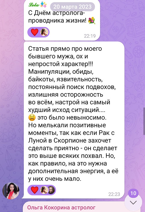 Если у Вас такое сочетание планет, или Вы знаете Раков с Луной в Скорпионе, пишите в комментариях свои наблюдения.